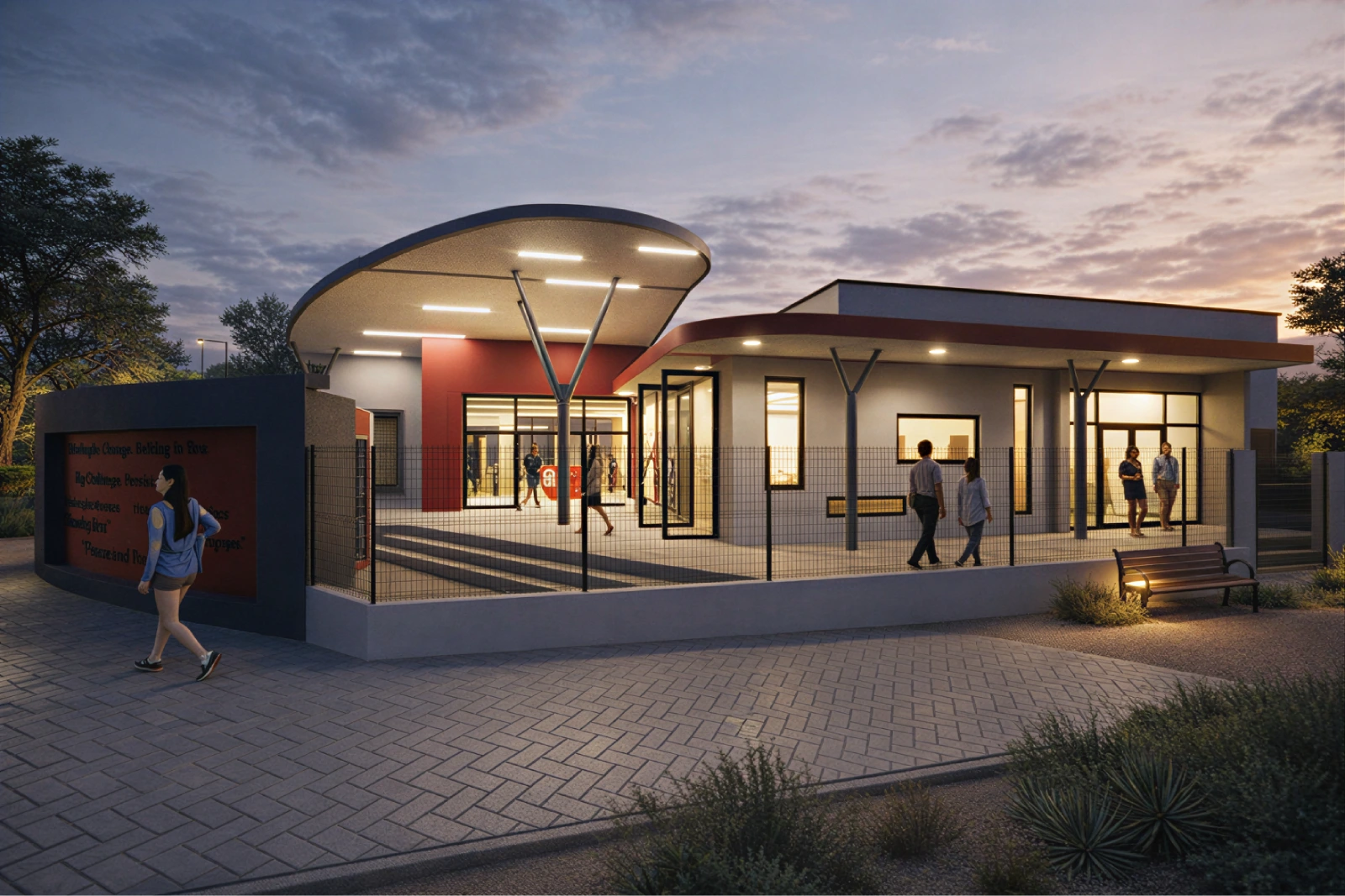 A floating entrance canopy creates a shaded public forecourt, encouraging gathering and engagement, while patterned steel screens reference African geometric motifs and provide climatic protection. The transparent office and flexible hall promote accessibility, participation, and community interaction.